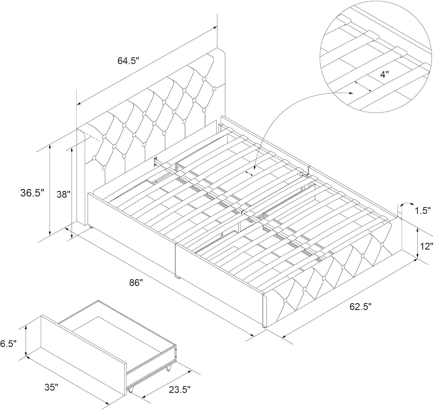 The dhp dakota upholstered platform bed is the perfect amount of contemporary luxury to transform your bedroom décor. Metal side rails for guaranteed stability and durability. This contemporary and chic bed frame is designed with graceful button tufted diamond patterns on both the headboard and footboard and upholstered in faux leather. With wooden slats to support the mattress, no box spring is needed, giving you the low profile look you love. 86l x 64.5w x 38h; This contemporary and chic bed frame is designed with graceful button tufted diamond patterns on both the headboard and footboard and upholstered in faux leather. Give yourself the bed you deserve! Dhp dakota upholstered platform bed, queen size frame, white. 35l x 23.5w x 6.5h; Center metal rail and leg for added support. Fast and free shipping free returns cash on delivery available on eligible purchase. Color:black faux leather | size:queen | style name:bed with storage drawers give yourself the bed you deserve! We've got you covered like a duvet.